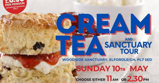 Cream Tea and Tour. Sunday 10 May 2026. Two sittings available – 11am or 2.30pm. £6.50 per person. Tickets must be purchased before event. Please telephone sanctuary on (01752) 347503 to book your seat.