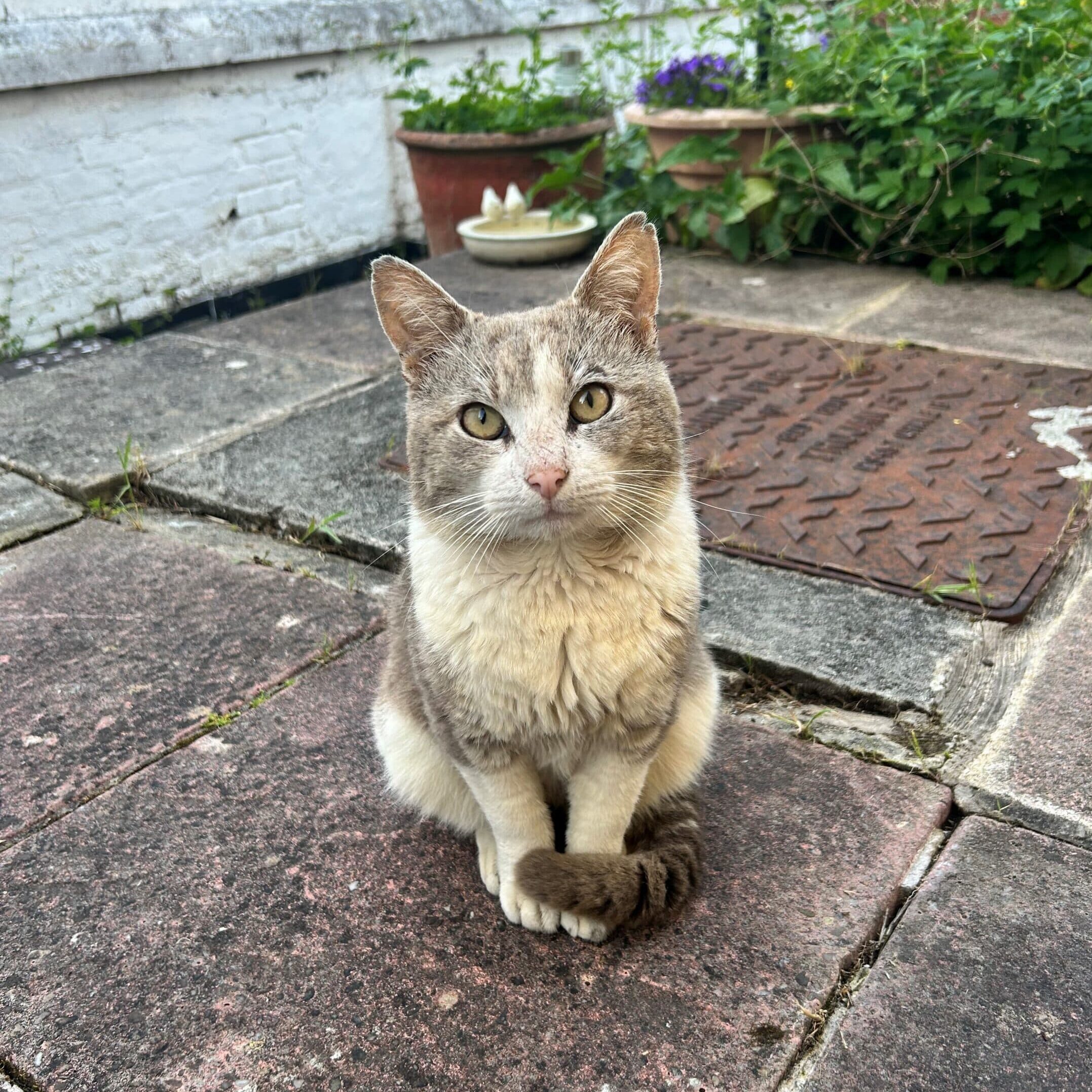 Bib is a grey and white domestic short hair, we believe he is around 3 years old.