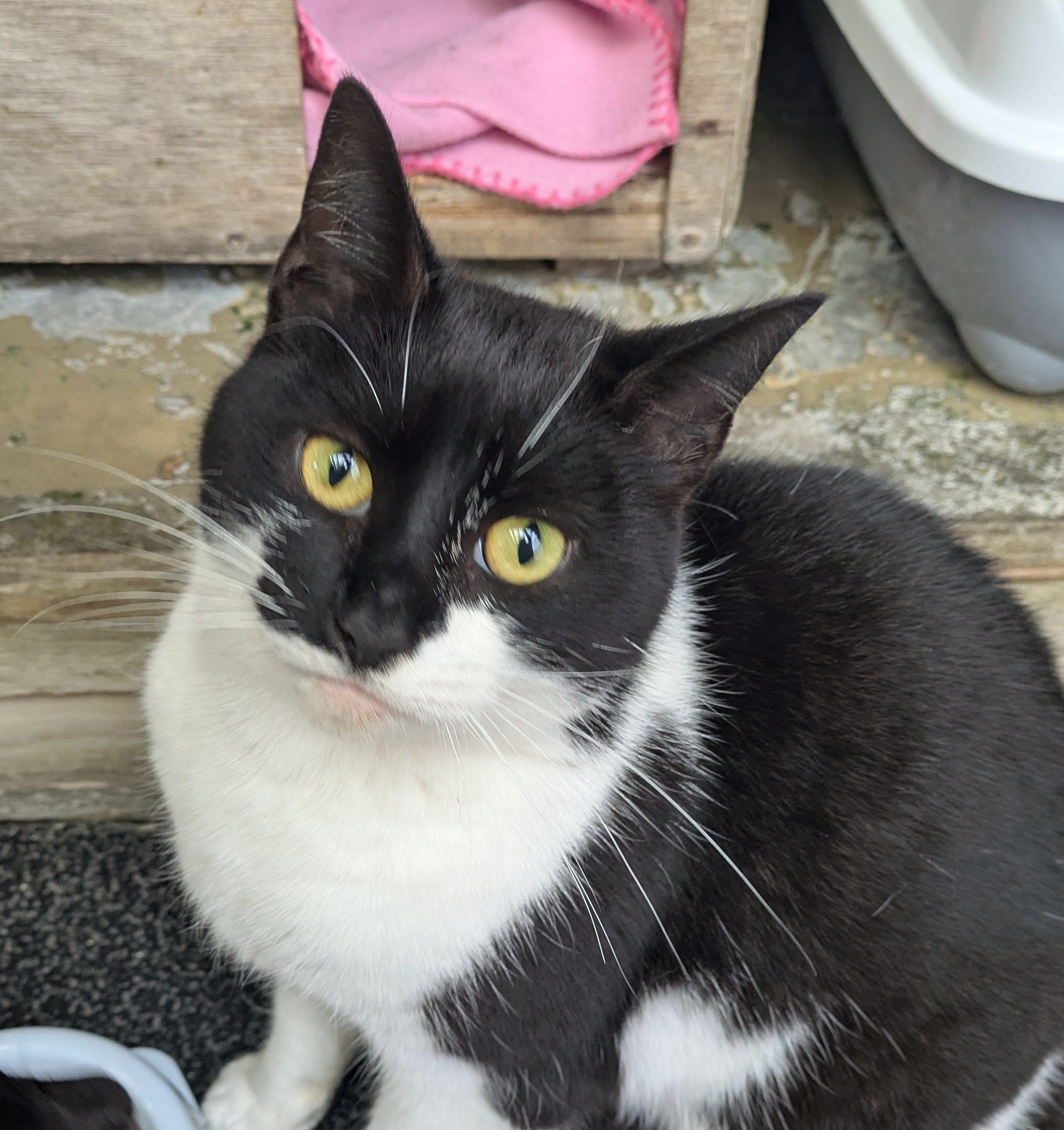 She is a friendly girl once she knows you and is able to live with cats dogs and possibly children!