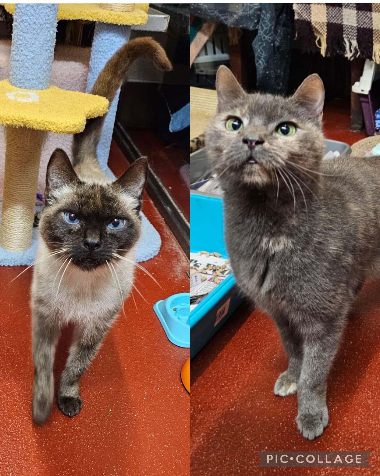 Max is an 8 year old grey torti and Tips is an 8 year old seal point