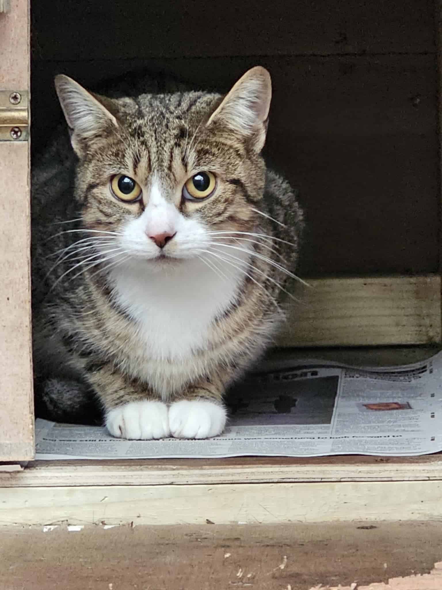 Star is a semi feral, tabby and white, spayed female looking for a stable type home where there are people around for company and also feeding. She doesn’t get on with other cats so will need to be the only cat in the barn.