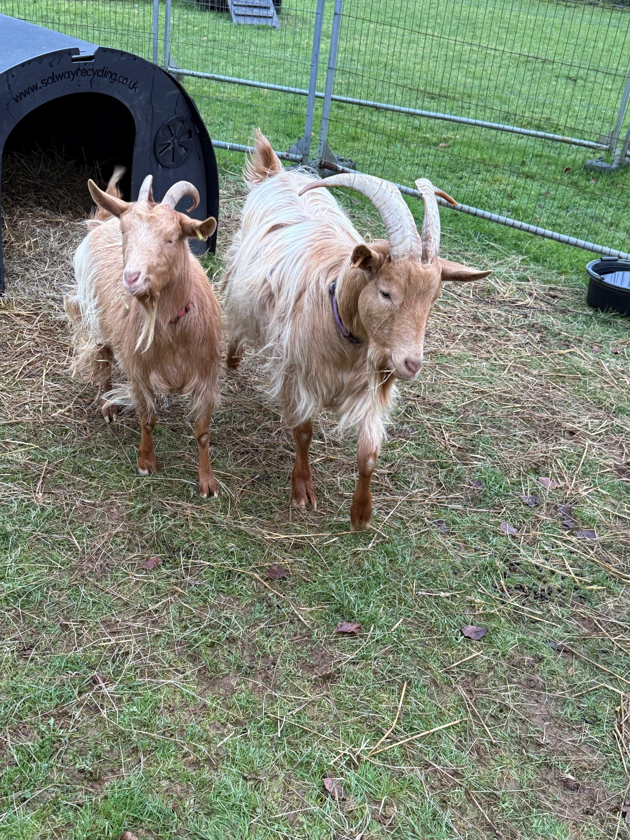 Golden Guernsey goats Teacup and Pie at Woodside in late 2025, aged 3. They very quickly made friends with our resident goats Wee Man, Maverick and Wendy and this easy-going pair, love being around people. Teacup will follow her carers around while Pie loves to play with Maverick.