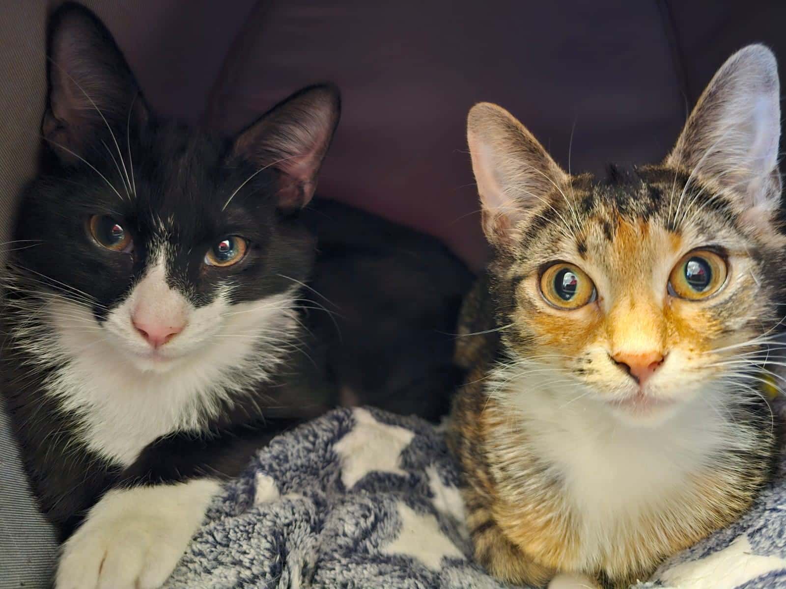 Violet is a 6 month old tabby/torti female and Lu is a 6 month old black and white male.